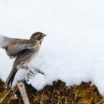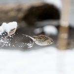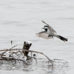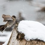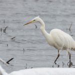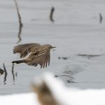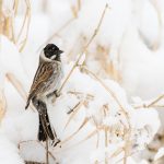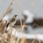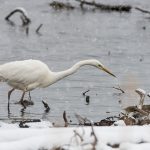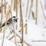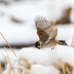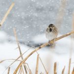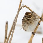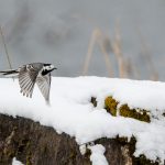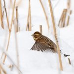 Zwischendurch schritt ein Silberreiher am Ufer entlang und auch ein Waldwasserläufer ließ sich zweimal blicken. Im dichten Schneefall zeigte sich kurz ein Wanderfalke und sorgte kurzfristig für Stille. Diese dauerte nicht lange an, da hatten sich eine Bachstelze und eine Rohrammer, beide auf Beutejagd, in den “Haaren”.