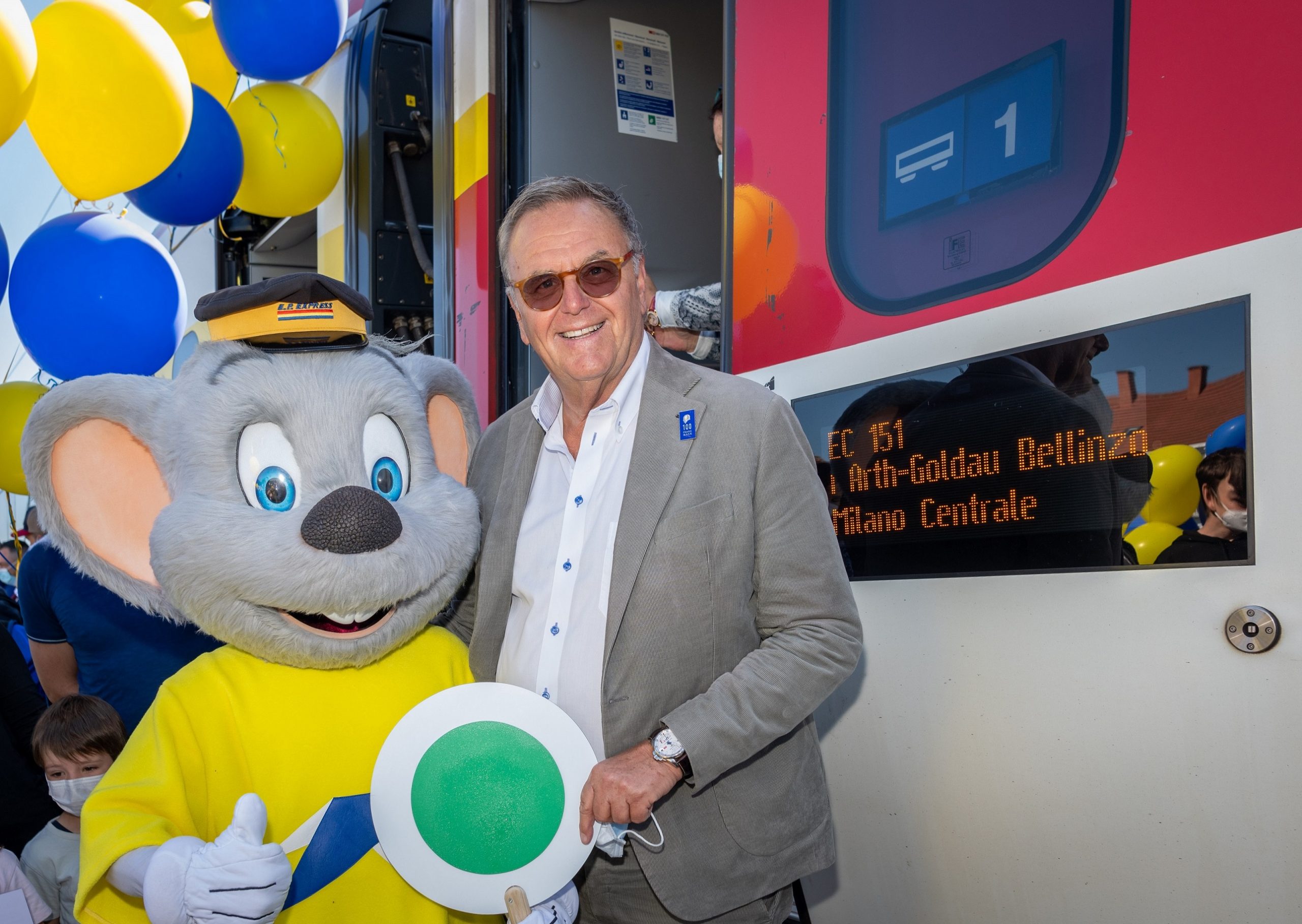 Europa-Park Inhaber Roland Mack und Ed Euromaus feiern den Halt des ersten EuroCityExpress 151