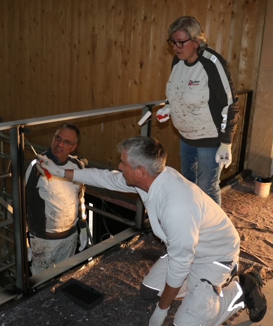 Pfarrer Paul Janßen (links) und die dritte Bürgermeisterin Monika Schmid (rechts) lassen sich von Malermeister Andreas Fischer (Mitte) in die Kunst des Streichens einweihen.