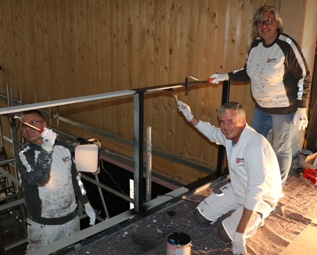 Pfarrer Paul Janßen (links) und die dritte Bürgermeisterin Monika Schmid (rechts) lassen sich von Malermeister Andreas Fischer (Mitte) in die Kunst des Streichens einweihen.