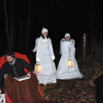 Auf dem weiteren Weg, inzwischen war aus der Dämmerung komplette Dunkelheit eingetreten, sahen die Besucher bei schwachem Licht von Kerzen, die den Weg säumten, einzelne Fellstücke als Indiz, für eine größere Zahl an Krampein. Aber stattdessen tauchten in der Finsternis zwei strahlend weiße Engel in größerem Abstand auf, die den Zug begleiteten bis in die Nähe des Deichelweihers, wo plötzlich ein Märchenerzähler in seinem Lehnstuhl auftauchte. Er las beim schwachen Licht einer Laterne die Geschichte von einem einsamen Krampus vor, der täglich geärgert wurde vom Floderer Dirndl auf der Dalsen Alm und schließlich auf dem Hexentanzplatz bei der Haidenholzalm landete, wo Hexen auf ihrem Besen im Funkenflug durch die Lüfte sausten. Von dort bekam er den Tipp zum Geigelstein zu laufen, dort würde er weitere Krampein aus seiner Familie treffen. So nahm die Geschichte einen guten Ausgang. Der Zug der Besucher ging weiter in Richtung Knogler Hof, wo das große Finale stattfand. Auf der Anhöhe erschienen erste wenige Irrlichter, die immer mehr wurden, ohrenbetäubende Musik hallte durch die Nacht und einzelne Gruppen von Krampein waren plötzlich hell erleuchtet zu sehen, wie sie untereinander kämpften. Erst schemenhaft waren zwei große Zahlen „20“ zu erkennen, die dann in der Schlussszene lichterloh aufflammten.