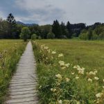 Noch vor dem See befinden wir uns bei Spöck auf dem höchsten Punkt unserer Radtour mit einem prächtigen Panoramablick auf den Chiemsee. Das Kleinod Bärnsee wurde 2014 vom Bund Naturschutz aufgekauft, um diese wertvolle Moorlandschaft langfristig zu erhalten. Auch der Biber ist hier wieder beheimatet. Die Uferbereiche des Sees dürfen allerdings nicht betreten werden (Vorsicht: Kreuzottern). Über einen gut befestigten Bohlenweg durchqueren wir das artenreiche Moor (“Aschauer Fuizn”) und befinden uns bald beim Natur-Moor-Freischwimmbad Aschau. Hier können wir das schöne Wasserrad bewundern, kneippen, uns im Bad erfrischen und am Kiosk verpflegen. Nun geht es weiter entlang der Prien, danach auf einem schönen Höhenweg hoch über der A8 über Frasdorf und Achenmühle nach Rohrdorf. Von dort fahren wir rasant über einen langen Downhill zum Inn und zurück nach Rosenheim.