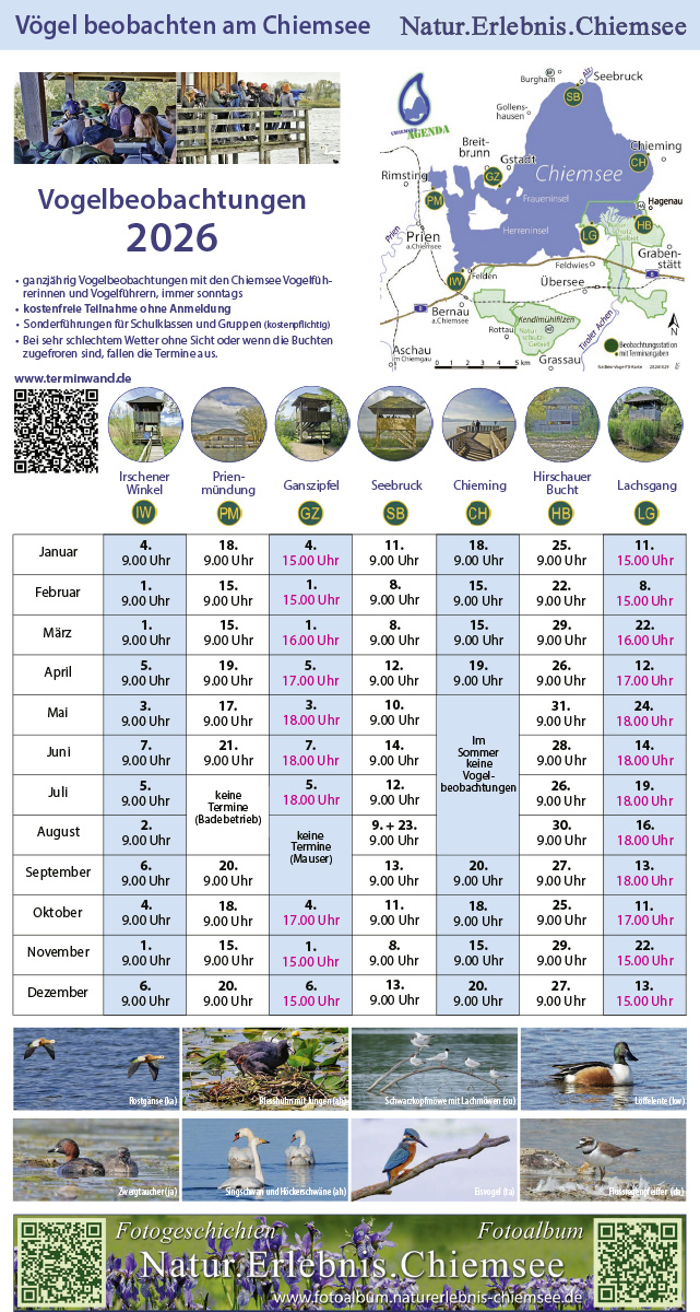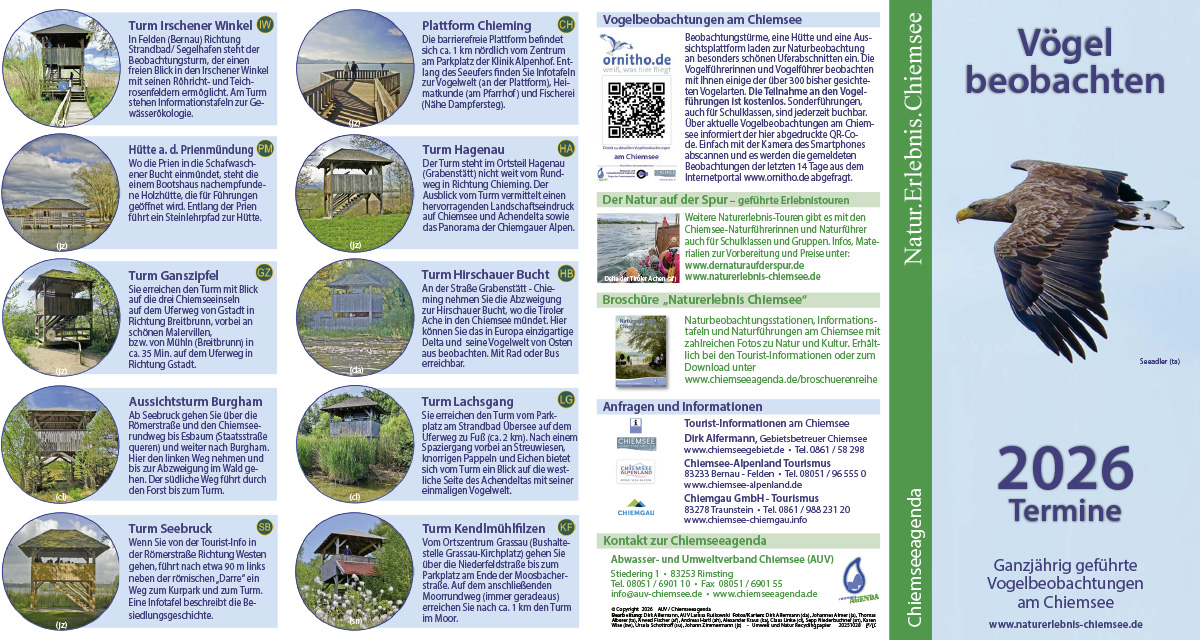 Das jährlich erscheinende Faltblatt bietet nicht nur alle Termine der kostenlosen Vogelbeobachtungen an sieben malerischen Standorten, sondern auch viele weitere Informationen zum Thema.