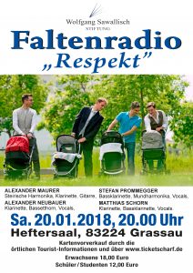 Vielleicht rätselt der ein oder andere Besucher am Ende des Konzertes am Samstag, 20. Januar, 20 Uhr, im Heftersaal immer noch, was sich hinter dem wunderschönen Bandnamen Faltenradio verbirgt. Doch dann hat man einen wunderschönen Abend mit vier Spitzenmusikern erlebt, zwischen Spaß, Wahnsinn und Musikgeschichte. Geboren zwischen 1976 und 1985 in Salzburg und der Steiermark spielen Alexander Maurer, Alexander Neubauer, Matthias Schorn und Stefan Prommegger bei den Wiener Philharmonikern und den Wiener Symphonikern. Alexander Neubauer ist Soloklarinettist bei den Symphonikern und veritabler Professor. Matthias Schorn ist Soloklarinettist bei den Philharmonikern, Klarinettist Stefan Prommegger lehrt am Musicum Salzburg. Akkordeonist Alexander Maurer unterrichtet an der Hochschule für Musik und Theater in München und an der Hochschule Linz. Im Quartett Faltenradio bringen sie über die perfekte Musik aus den unterschiedlichsten Genres hinaus mit ihrem Programm „Respekt“ Sprechgesang, Volkstanz, Kabarett und einfach Spaß in den Saal. „Herausgekommen ist ein leidenschaftliches Plädoyer für Mitmenschlichkeit und gegen Xenophobie, ein Crossover aus Klassikanleihen und Volksmusikklängen, aus Tango-Assoziationen, Klezmer-Tönen und Gipsy-Jazz-Fetzen“, beschreibt es die Süddeutsche Zeitung. Die Musiker versprechen extreme Kontraste und spannungsgeladene Momente.