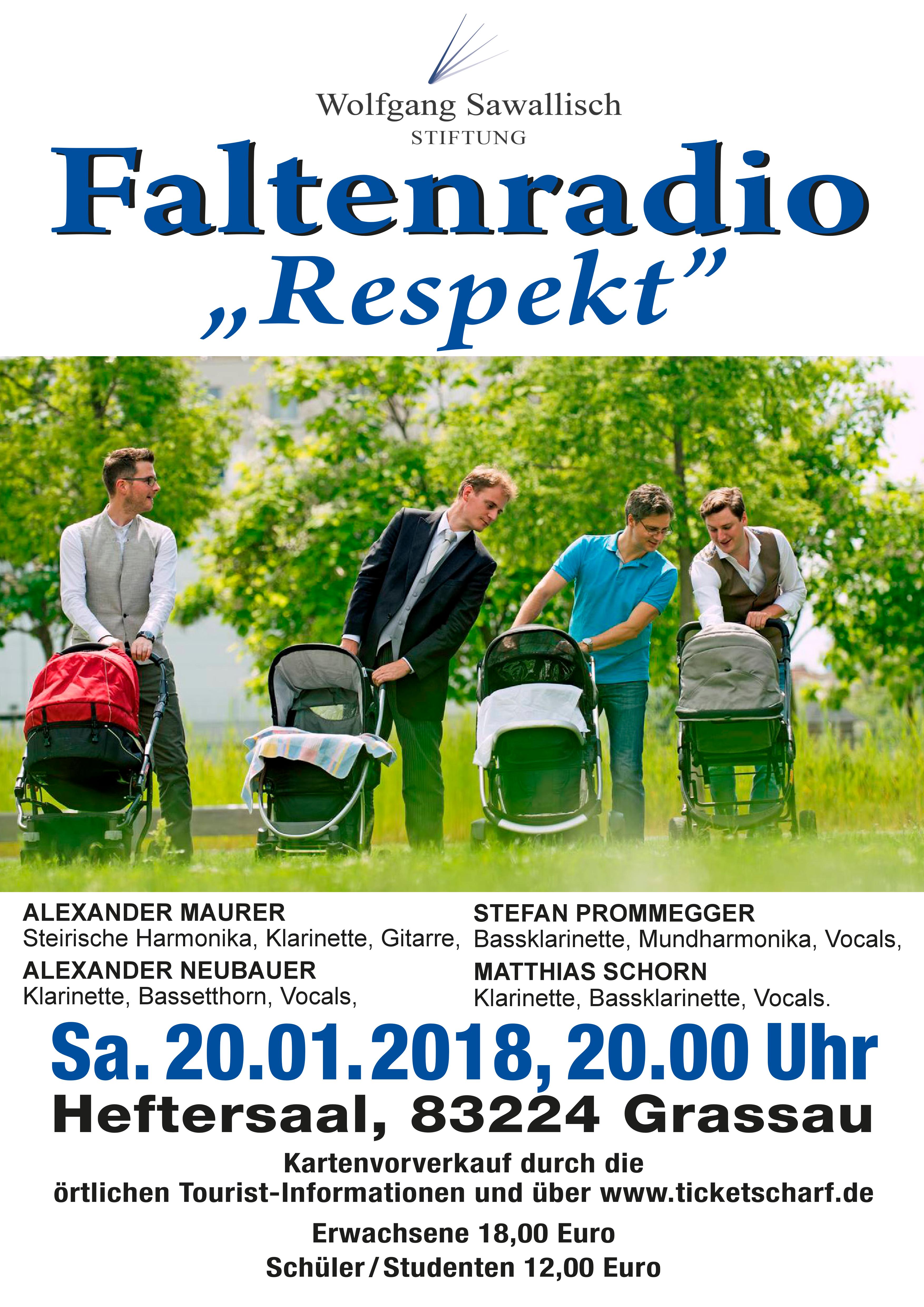 Vielleicht rätselt der ein oder andere Besucher am Ende des Konzertes am Samstag, 20. Januar, 20 Uhr, im Heftersaal immer noch, was sich hinter dem wunderschönen Bandnamen Faltenradio verbirgt. Doch dann hat man einen wunderschönen Abend mit vier Spitzenmusikern erlebt, zwischen Spaß, Wahnsinn und Musikgeschichte. Geboren zwischen 1976 und 1985 in Salzburg und der Steiermark spielen Alexander Maurer, Alexander Neubauer, Matthias Schorn und Stefan Prommegger bei den Wiener Philharmonikern und den Wiener Symphonikern. Alexander Neubauer ist Soloklarinettist bei den Symphonikern und veritabler Professor. Matthias Schorn ist Soloklarinettist bei den Philharmonikern, Klarinettist Stefan Prommegger lehrt am Musicum Salzburg. Akkordeonist Alexander Maurer unterrichtet an der Hochschule für Musik und Theater in München und an der Hochschule Linz. Im Quartett Faltenradio bringen sie über die perfekte Musik aus den unterschiedlichsten Genres hinaus mit ihrem Programm „Respekt“ Sprechgesang, Volkstanz, Kabarett und einfach Spaß in den Saal. „Herausgekommen ist ein leidenschaftliches Plädoyer für Mitmenschlichkeit und gegen Xenophobie, ein Crossover aus Klassikanleihen und Volksmusikklängen, aus Tango-Assoziationen, Klezmer-Tönen und Gipsy-Jazz-Fetzen“, beschreibt es die Süddeutsche Zeitung. Die Musiker versprechen extreme Kontraste und spannungsgeladene Momente.