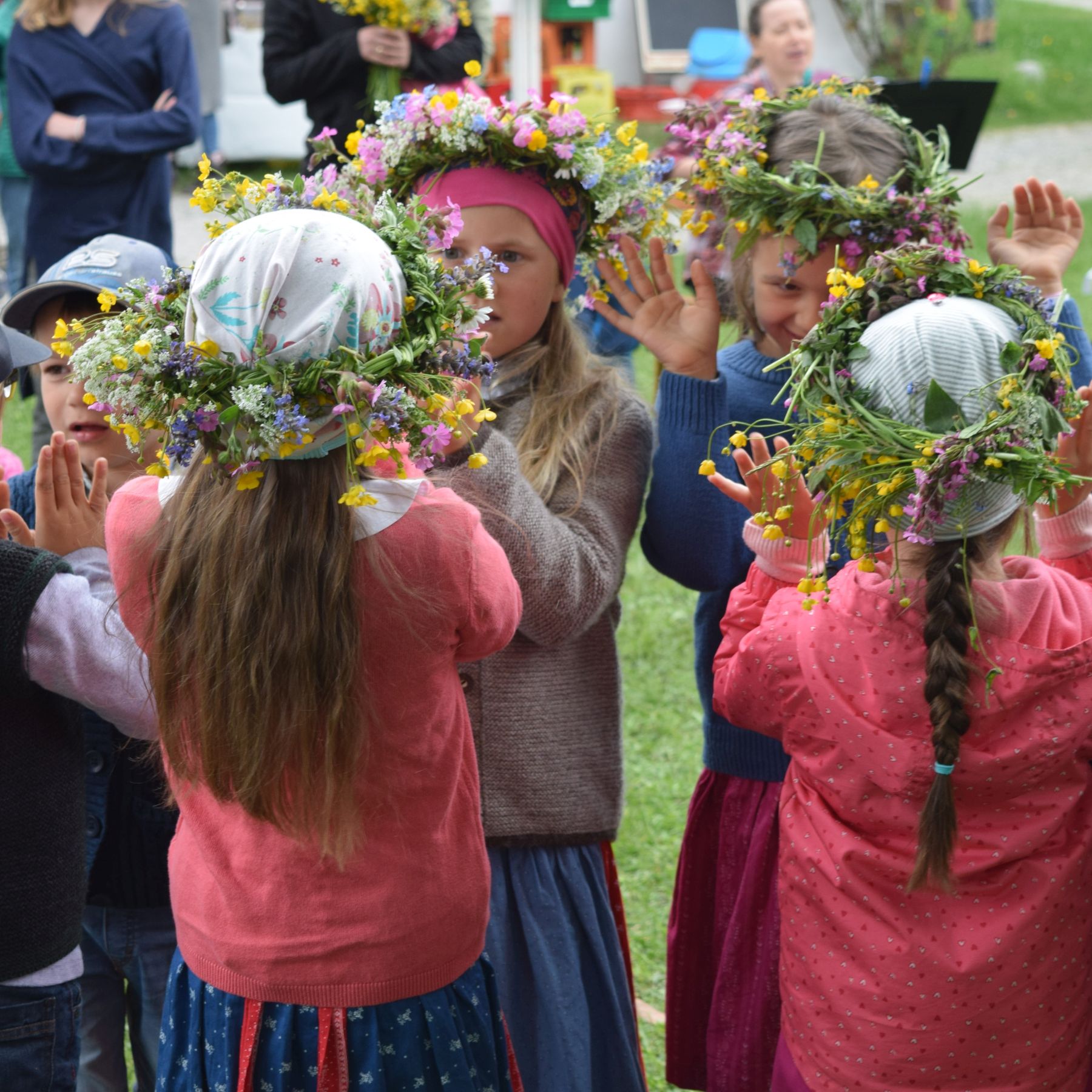 Mit wunderschönen Blumenkränzen geschmückte Kinder tanzen um den Maibaum