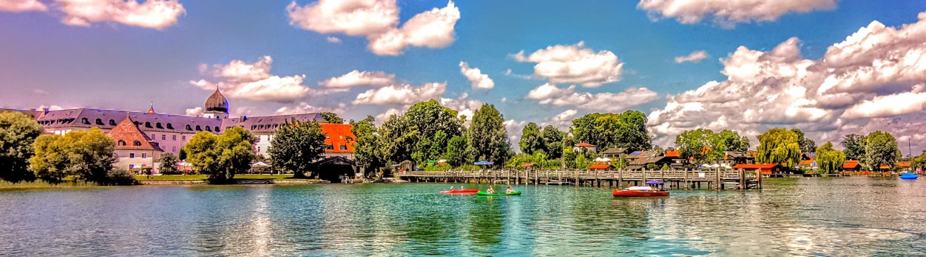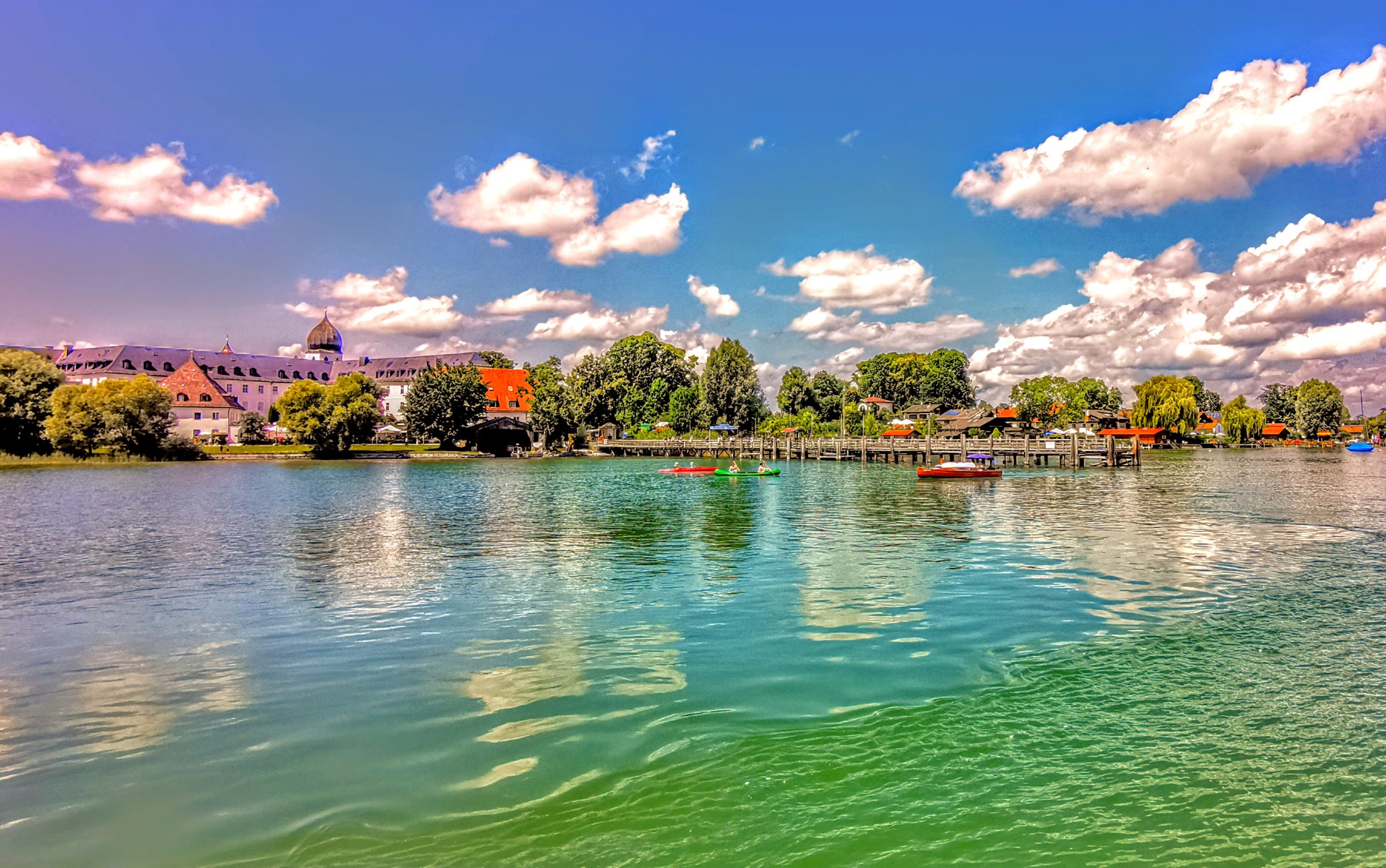 Die Fraueninsel im Chiemsee ist bekannt für ihre ganzjährige Wandlungsfähigkeit. Dies gilt nicht nur wegen der einzigartigen Lage inmitten des Chiemsees, sondern auch deswegen, weil zu allen vier Jahreszeiten, zu allen Tages- und Vorabendzeiten und zu allen ganz und gar unterschiedlichen Witterungsverhältnissen das Eiland in immer wieder neuen Farb-Kompositionen auftaucht – so wie auf diesem aktuellen Bild.