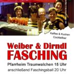 Erstmals beginnt der Fasching bereits am Nachmittag mit einem Weiber- & Dirndl-Fasching ab 15 Uhr. Dazu sind alle Mädchen und Frauen jeden Alters herzlich eingeladen. Bei Kaffee und Kuchen oder einem Cocktail lässt sich der Nachmittag beschwingt starten. Für besondere Unterhaltung sorgen die Showeinlagen der Blau-Weiß-Kammer und der Traunwalchner Frauengruppe. Mit dem Eintrittsband vom Nachmittag kann zudem auch die Abendveranstaltung besucht werden.