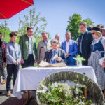 Gastgeberin für die Bayerische Landesgartenschau zu sein, ist für die Stadt Freyung ein einmaliges Ereignis. Im Goldenen Buch der Stadt wird das mit den Unterschriften verewigt: (v.li.) LGS-Geschäftsführerinnen Claudia Lenz und Katrin Obermeier, Landrat Sebastian Gruber, Staatsminister für Wohnen, Bau und Verkehr Christian Bernreiter, Ministerpräsident Dr. Markus Söder, Honigkönigin, Staatsminister für Umwelt und Verbraucherschutz Thorsten Glauber, Bürgermeister Dr. Olaf Heinrich, stellv. Landrätin Helga Weinberger.