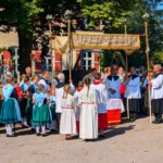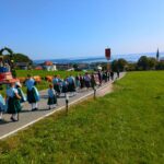 An der anschließenden Prozession, die Stationen am Kindergarten, auf freiem Feld und an der Aussichtskapelle einlegte, beteiligten sich neben dem Chor und den Blasmusikanten auch die Feuerwehr, der Trachtenverein, der Schützenverein sowie der Veteranenverein, jeweils mit ihren Fahnenabordnungen. Die Frauen und Männer des Trachtenvereins „Almarausch“ nahmen hierbei in ihrer festlichen Tracht teil.