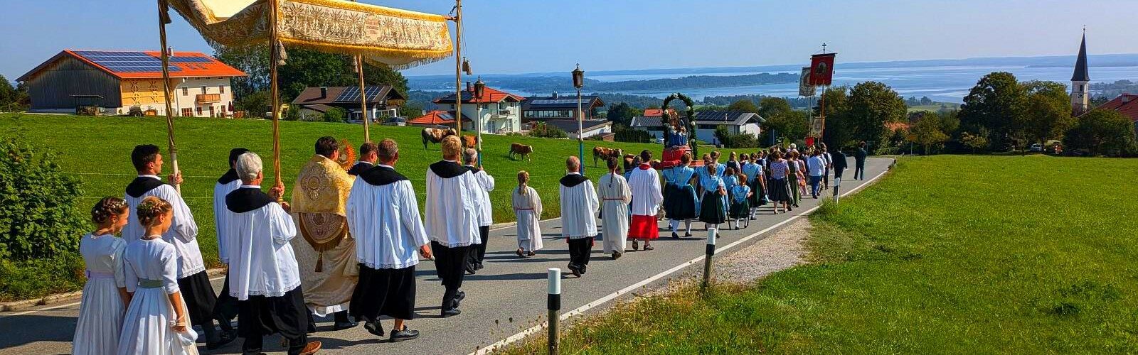 An der anschließenden Prozession, die Stationen am Kindergarten, auf freiem Feld und an der Aussichtskapelle einlegte, beteiligten sich neben dem Chor und den Blasmusikanten auch die Feuerwehr, der Trachtenverein, der Schützenverein sowie der Veteranenverein, jeweils mit ihren Fahnenabordnungen. Die Frauen und Männer des Trachtenvereins „Almarausch“ nahmen hierbei in ihrer festlichen Tracht teil.