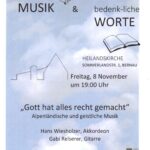 Am Freitag, 8. November, 19 Uhr, spielen Hans Wiesholzer mit dem Akkordeon und Gabi Reiserer mit der Gitarre unter dem Motto “Gott hat alles recht gemacht, alpenländische und geistliche Musik zur Einkehr und zur Ehre Gottes” (so der Langtitel, für’s Plakat hab ich ein bissl gekürzt), dazu gibt’s besinnliche Texte. Die beiden Volksmusikanten sind sicherlich nicht völlig unbekannt, in der Bernauer Heilandskirche sind sie zum ersten Mal zu hören ganz nach dem Gesamtmotto “Feine Musik und bedenk-liche Worte”. Wie immer ist der Eintritt frei, eingelegte Spenden gehen an die Musiker, auch wie immer wird in Anschluß eingeladen, den Abend gemeinsam bei Gespräch und einem Glasl abzurunden.