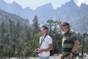 Geologe Dr. Stefan Kellerbauer (r.) und der professionelle Drohnenpilot Alexander Koller analysieren aus sicherer Entfernung den Felssturzbereich im hinteren Wimbachtal mit einer Spezialdrohne und Virtual Reality (VR)-Brillen. Die hochauflösenden Videos zeigen: Der vom Talboden deutlich sichtbare Riss setzt sich noch rund 30 Meter weiter in den Fels hinter der Wand fort. Damit steht der in der Wand verbliebene Felsklotz ohne Verbindung zum festen Fels. Die Gefahr eines weiteren Felssturzes bleibt akut.