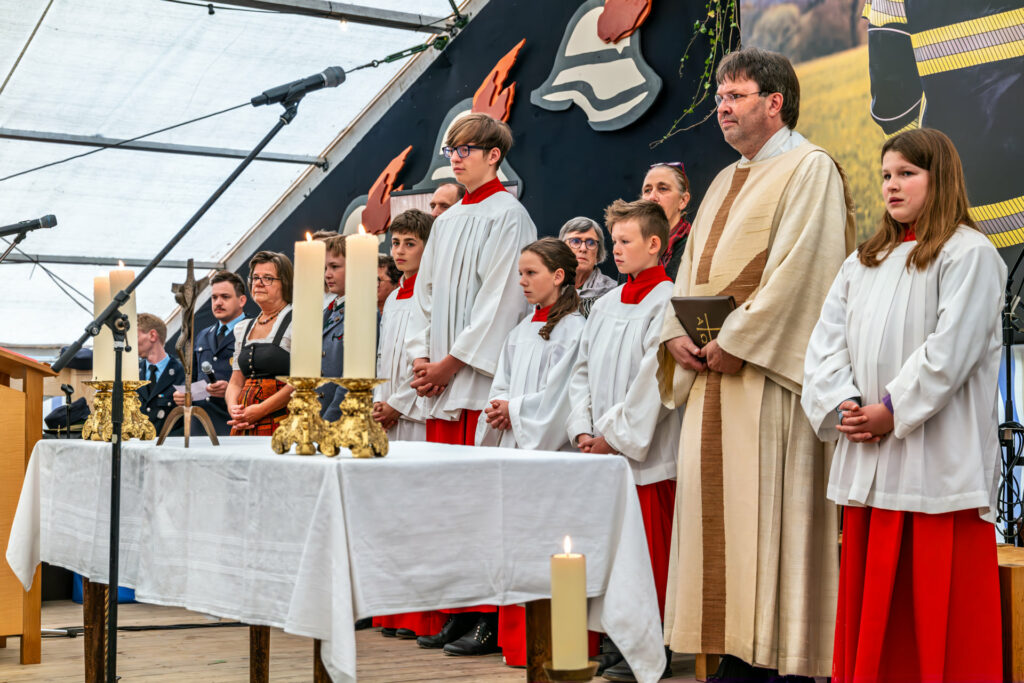 Ein besonderer Moment im Festzelt: Gemeindereferent Tobias Gaiser und die Ministranten gestalteten den feierlichen Gottesdienst zum Jubiläum der Feuerwehr Riedering mit großer Andacht und spürbarer Gemeinschaft.
