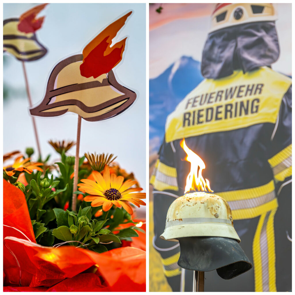 Symbol mit Strahlkraft: Der brennende Feuerwehrhelm war das Leitmotiv des Jubiläums der Freiwilligen Feuerwehr Riedering. Links im Bild ist das offizielle Festzeichen des 150-jährigen Jubiläums zu sehen: ein stilisierter Feuerwehrhelm mit Flamme – eingebettet in Blumenschmuck auf den Festtischen. Rechts wurde dieses Symbol beim Festgottesdienst eindrucksvoll zum Leben erweckt: Ein echter Feuerwehrhelm brannte im Altarraum – als Zeichen für das, wofür Feuerwehrleute einstehen. Gemeindereferent Tobias Gaiser erklärte die tiefere Bedeutung in seiner Predigt: „Ein Helm schützt – und er steht zugleich für Verantwortung, für Mut, für Überzeugung. Wer ihn aufsetzt, brennt für andere, brennt für die Sache.“ Der flammende Helm wurde so zu einem eindrucksvollen Sinnbild für gelebte Mitmenschlichkeit und das große Engagement der Feuerwehr – damals wie heute.