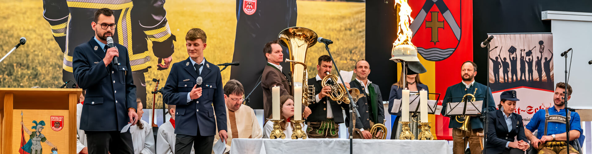 Im Mittelpunkt des Festgottesdienstes stand ein starkes Symbol: Ein brennender Feuerwehrhelm auf der Bühne, angelehnt an das offizielle Logo des Feuerwehrfestes, wurde zum Sinnbild des Tages – und für das, wofür die Feuerwehr steht. Gemeindereferent Tobias Gaiser, der den Gottesdienst leitete, stellte in seiner Predigt die Symbolik des Helms in den Mittelpunkt.