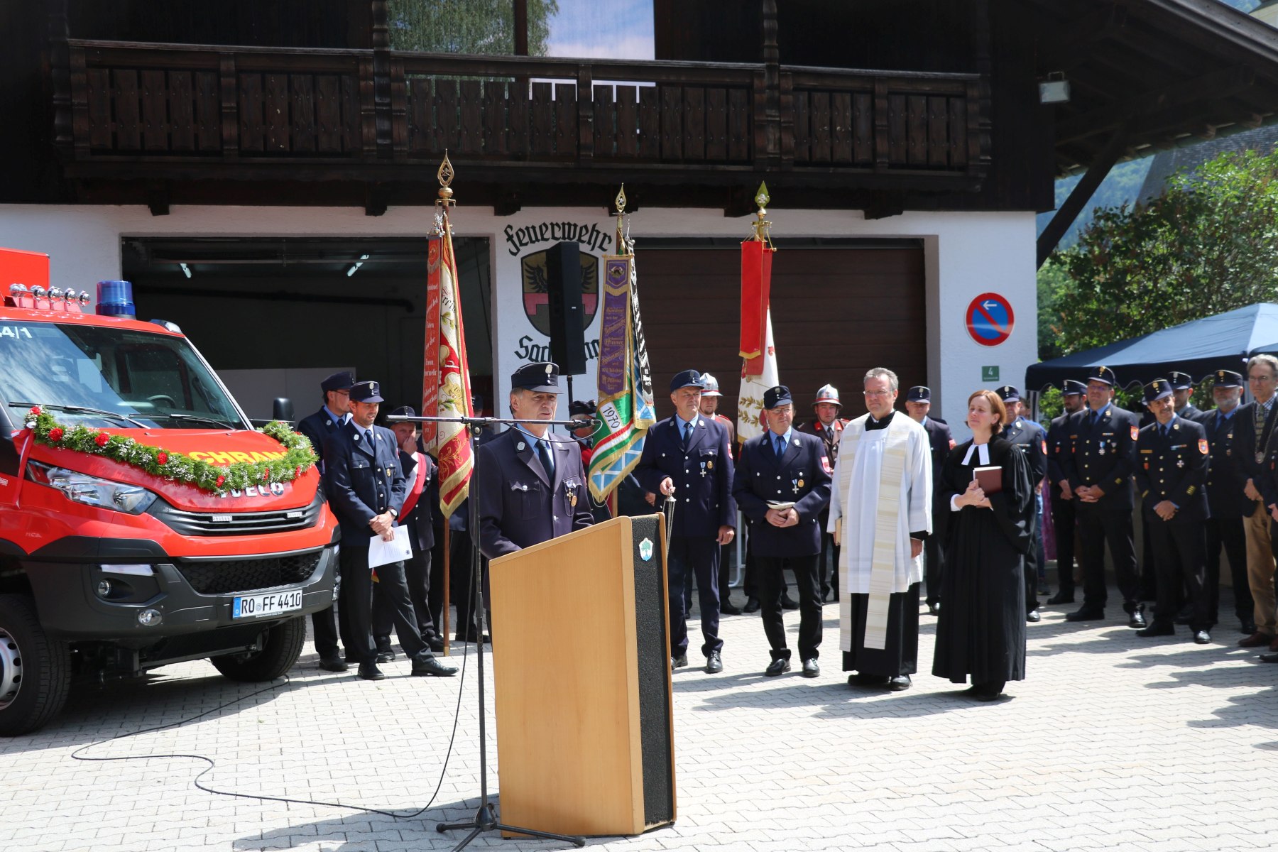 Pfarrer Paul Janßen segnete das neue Tragkraftspritzenfahrzeug-Logistik TSF-L auf dem Platz vor dem Sachranger Feuerwehrhaus.