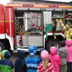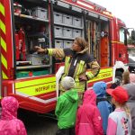 Alle Kinder durften dann das Löschfahrzeug der Aschauer Wehr vor dem Kindergarten anschauen. Stolz führten die beiden Feuerwehrleute ihr Löschfahrzeug vor, sie erklärten das Fahrzeug und das Gerät, den schweren Atemschutz und die ganzen Werkzeuge rund ums Auto. Der Höhepunkt für alle Buben und Mädchen war es schließlich, im Löschfahrzeug sitzen zu dürfen und dazu schaltete der freundliche Feuerwehrmann dann auch noch das Blaulicht und das Martinshorn ein! Mit lautem „Tatü-Tata“ verabschiedeten sich Tobias Brinkmann und Markus Vordermayer zum Schluss aus dem Spatzennest.