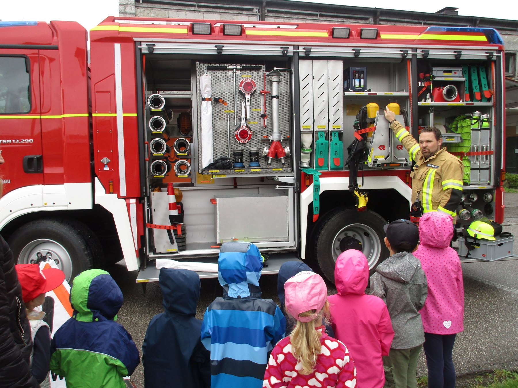 Kommandant Tobias Brinkmann von der Aschauer Feuerwehr erklärt den Kindern im Kindergarten Spatzennest das große Löschfahrzeug der Feuerwehr