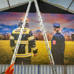 Blick auf das eindrucksvolle Bühnenbild am Vortag des Festbeginns: Zwei Feuerwehrleute – Rücken an Rücken, vereint im Dienst – schauen hinaus auf die Heimat und stehen symbolisch für 150 Jahre Einsatz, Zusammenhalt und Verantwortung in Riedering.