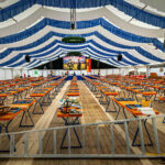 Ein Blickfang im Festzelt ist das großformatige Bühnenbild mit Blick auf die Alpen: Zwei Feuerwehrleute – symbolisch für Tradition und Zusammenhalt – blicken in die Weite. Auch das aufwendig dekorierte Zelt mit weiß-blauen Stoffbahnen, Kränzen und den klassischen Bierzeltgarnituren zeugt vom hohen Anspruch an Gestaltung und Gastfreundschaft.