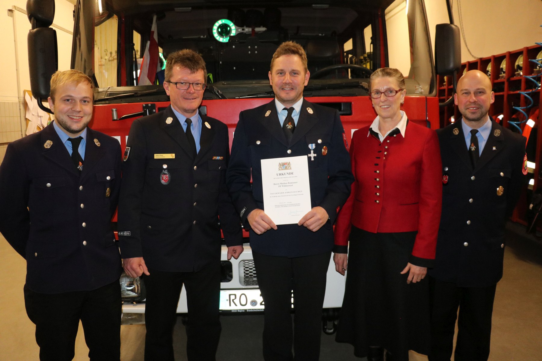 Markus Ramsauer (Mitte) erhielt das silberne Feuerwehrehrenzeichen des Freistaats Bayern für 25 Jahre aktiven Feuerwehrdienst, unterschrieben vom bayerischen Innenminister Joachim Hermann. Es gratulieren Kommandant Florian Fischer, Bürgermeisterin Marianne Steindlmüller, Kreisbrandmeister Stefan Pfliegl und der Kommandantenstellvertreter Martin Zettl. (von rechts).