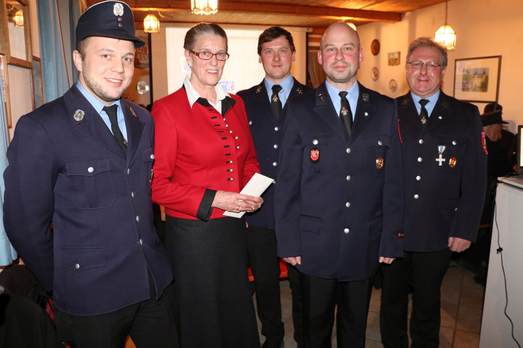 Mit einer Einladung in die Wildenwarter Schlosswirtschaft verabschiedeten die beiden Vorsitzenden und die Kommandanten der Wildenwarter Feuerwehr für die Wildenwarter Feuerwehrleute „ihre Bürgermeisterin und Chefin“ Marianne Steindlmüller, die sich bei den kommenden Wahlen nicht mehr zur Wahl stellen wird. Von links Kommandantenstellvertreter Martin Zettl – Bürgermeisterin Marianne Steindlmüller – der Vorsitzende der Wildenwarter Feuerwehr Michael Ramsl – Kommandant Florian Fischer – der stellvertretende Vorsitzende der Wildenwarter Feuerwehr Alfred Vodermaier