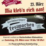 Am 23. März 2024 fand unter dem Motto “Mia kleb’n eich oan!” eine dorfinterne Veranstaltung in Greimharting statt. Die vielen freiwilligen Helfer beklebten während des gesamten Nachmittags ca. 100 Autos mit Heckscheibenaufkleber für das bevorstehende Festzel vom 06.-16. Juni 2024.
