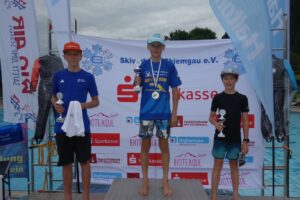 Gesamtsieger Zeno Rumpfinger vom WSV Oberaudorf (Mitte) bei der Gesamtsiegerehrung der Klasse Schüler 12 – 13. Links der Zweite dieser Klasse Tobias Hinterseer vom SK Berchtesgaden, rechts der Dritte Leopold Hinterberger vom WSV Reit im Winkl.