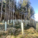Fotos: Hötzelsperger – 1. Von links: Anton Stein, Luisa Mix aus Prien, Sophia Steiner aus Prien, Kilian Schuster aus Mitterreith, Mithelfer Tobias Hefter aus Moosen, Sophia Hirn aus Rimsting und ihre Firmpatin Elisabeth Pichler. 2. Der vorjährige Pflanzplatz mit den umhüllten Jungbäumen.