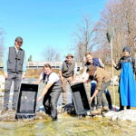 Mit dabei waren Ludwig Freiherr von Cramer-Klett (rechts), Revierjagdmeister Josef Rinner (vierter von links), Revierjäger-Auszubildender Maximilian Jöchler (dritter von links) und Markus Vordermayer (fünfter von links). Auch Aschaus Erster Bürgermeister Simon Frank (kniend links) packte tatkräftig mit an und zeigte sich begeistert von dieser naturnahen Initiative mitten im Ortskern von Aschau i.Chiemgau. Die einjährigen Jungfische wurden in der Fischzucht Alpenland in Karlstein bei Bad Reichenhall herangezogen und durch deren Auszubildenden Xaver Streitwieser übergeben. Gespendet wurden sie vom Aschauer Karl Sollinger. Ziel der Maßnahme ist es, die Fischpopulation zu stützen und langfristig zu erhalten.