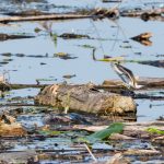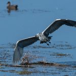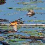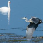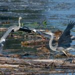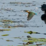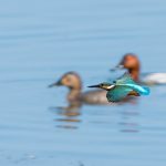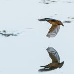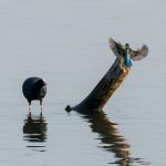 An der Hirschauer Bucht angekommen übten sich schon die Bachstelzen im Tiefflug über dem See. Kiebitze drehten über der Bucht in Gruppen ihre Runden. Der Eisvogel zeigte sein fliegerisches Können knapp über dem Wasser und überzeugte selbst ein Blässhuhn mit einer punktgenauen Landung aus voller Fahrt. Gleiches zeigte der Flussuferläufer vor den Augen einer Schildkröte, die sich davon aber wenig beeindrucken ließ. Der Grünschenkel zog durch die neugierigen Enten elegant seine Kurven. Zwischendurch erbeutete der Eisvogel ein kleines Fischlein und präsentierte es geschickt im Flug. Nach einem gesprungenem Wasserstart schüttelte sich der Graureiher das Wasser aus dem Gefieder und drehte in einer Steilkurve vor dem Turm ab. An einer Start-/Landebahn kam es dann zwischen zwei übermütigen Graureihern fast zu einer Kollision. Zu was ein für die Jagd extrem optimierte Körper fähig ist zeigte der Eisvogel, als er mit fast “Überschallgeschwindigkeit” durch die Menge und am Turm vorbei “donnerte”. Zum Abschluss drehte eine Bekassine noch eine Platzrunde, bevor sie entlang der Uferlinie entschwand.