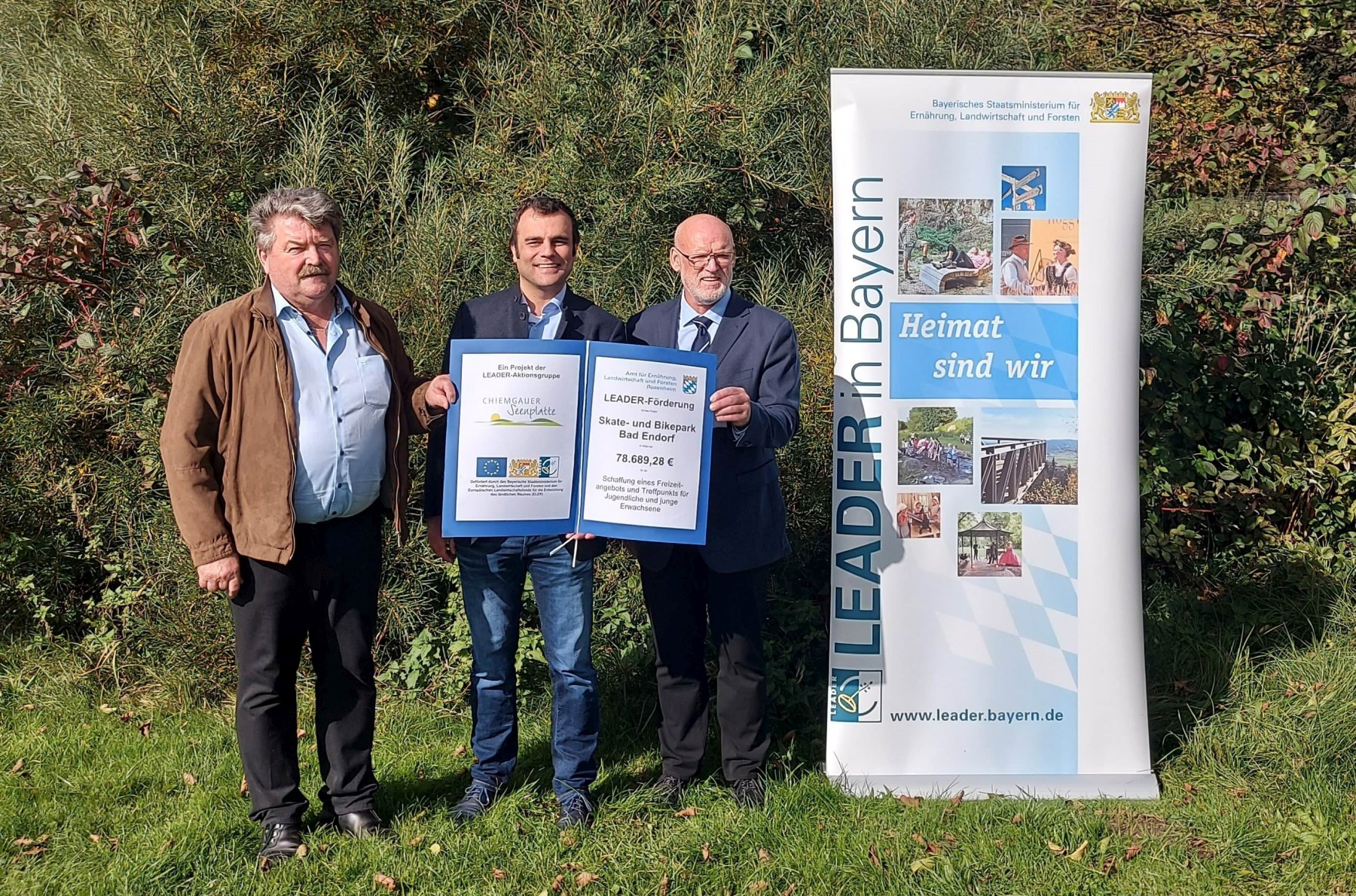 Bei der Übergabe des Zuwendungsbescheids (von links) Vorsitzender der LAG Chiemgauer-Seenplatte Sepp Reithmeier, Bürgermeister Alois Loferer und Leader-Koordinator am AELF Rosenheim Johann Kölbl. Foto: LAG Chiemgauer-Seenplatte