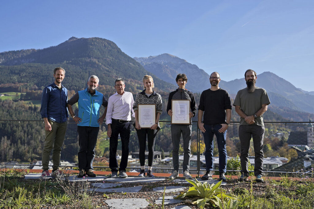 Juliana Eggers (Mitte) und David Reichl (3.v.r.) erhielten in diesem Jahr die Förderpreise des Vereins „Freunde des Nationalparks Berchtesgaden e.V.“ vom Vorsitzenden Manfred Bauer (3.v.l.). Nationalparkleiter Dr. Roland Baier (2.v.l.) und das Forschungsteam mit Michael Maroschek, Prof. Rupert Seidl (v.r.) sowie Dr. Rudolf Reiner (l.) gratulierten.