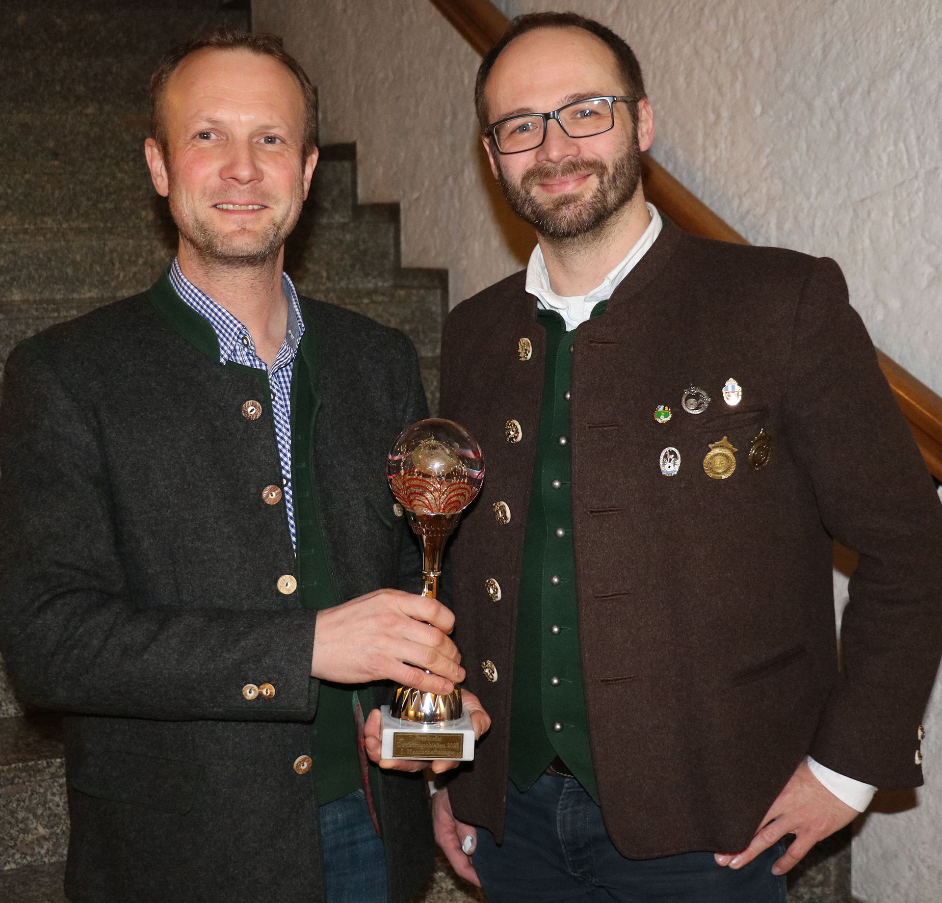 Schützenmeister Rupert Marinus Wörndl (rechts) übergibt den Siegerpokal an Hauptmann Hubert Stein als Mannschaftsführer des Mannschaftsmeisters: Gebirgsschützenkompanie.