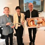 Verbunden mit den besten Wünschen für die Zukunft übergaben Architekt Arndt Sänger (links) und Landrat Bernhard Kern symbolische Schlüssel an Schulleiterin Sabine Ofner.