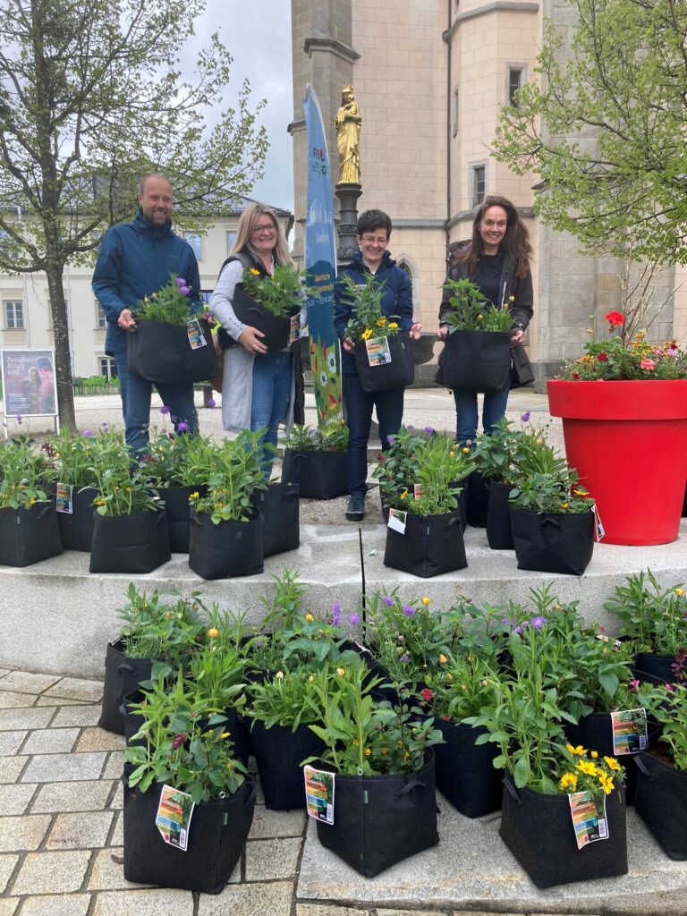 „Freyung erblüht“ – die Mitarbeiter der Gärtnerei Ziereis, die gerade auf dem Gelände der Landesgartenschau beschäftigt sind, haben 180 Pflanztaschen, gesponsert vom Hersteller MIHA, in drei verschiedenen Größen bepflanzt. Am Freyunger Kirchplatz konnten sich die Mitglieder der Werbegemeinschaft diese Pflanztaschen mit Ziersalbei, Eisenkraut, Strohblumen, Zauberglöckchen und Zweizahn abholen. Diese Taschen sind sehr praktisch und können leicht umplatziert werden. Geschäfte und Lokale im Innenstadtbereich schmücken sich mit diesen bunten Farbtupfern. Mit der Aktion Stadt.Mitte.Erleben. der Freyunger Werbegemeinschaft schlägt die Stadt eine Brücke zwischen dem Geyersberg, wo vom 25. Mai bis 03. Oktober die Bayerische Landesgartenschau stattfindet, und dem Stadtzentrum. Die Begrünung der Innenstadt ist nur eine von verschiedenen Aktionen im Zuge der Landesgartenschau.