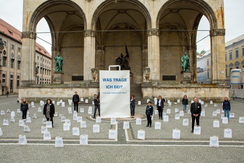 Die Papiertüte bietet dabei Platz auf der Vorder- und Rückseite, um persönliche Gedanken aufzuschreiben und die Tüte ganz individuell zu gestalten, so der Künstler Johannes Volkmann. Durch das Weitergeben der Tüten, z.B. an Freunde oder Bekannte, kommen Menschen miteinander ins Gespräch und selbst zu Botschafter*innen des Friedens. „Wir möchten uns künstlerisch dem Thema nähern: Im Zentrum unserer Aktion steht eine einfache Papiertüte. Sie eröffnet den Raum zum Nachdenken, Diskutieren und Kreativ werden, um Antworten zu finden auf die Frage, was jeder und jede für ein friedlicheres Zusammenleben beitragen kann“, so die Initiatorin dieser Kunstinstallation und Direktorin der Domberg-Akademie, Claudia Pfrang. Die gestalteten Papiertüten oder Fotos davon, sollen Teil einer Ausstellung und Theaterperfomance zum Abschluss der Kunstinstallation im Jahr 2022 werden. So gibt es die Möglichkeit, in Schulworkshops mit den Tüten zu arbeiten oder einen Abend in der Gemeinde zu gestalten, so Patrizia Wackers, Leiterin für den Bereich globales Lernen und Entwicklung der Erzdiözese München und Freising. Sollte die Münchner Sicherheitskonferenz im Frühjahr 2022 wieder in Präsenz stattfinden, wird es ein Ökumenisches Friedensgebet, verbunden mit der Kunstinstallation, geben.