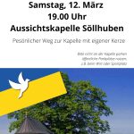 Söllhuben/Riedering/Hirnsberg: Ein Zeichen für den Frieden soll am Samstag, 12. März um 19.00 Uhr gesetzt werden. „Auf dem Weg für den Frieden“ ist das Motto und die Überschrift. Viele Menschen mit Lichtern und Laternen sollen sich auf den Weg machen um sich dann gemeinsam um 19.00 Uhr an der Aussichtskapelle in Söllhuben zu treffen, um dort ein Zeichen für den Frieden zu setzen. Einige Einzelpersonen hatten diese Idee, die nun gebündelt in Kooperation mit dem Pfarrerband und der Pfarrei konkret wird.
