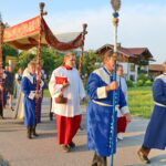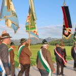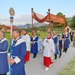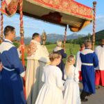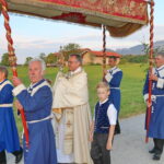 Fronleichnam in Frasdorf – der Prangertag machte seinem alten Namen alle Ehre: Pfarrer Paul Janßen – geleitet von den Consultoren der Frasdorfer Bruderschaft – segnete mit dem Allerheiligsten das festlich geschmückte Dorf und seine Bewohner, die Fluren und Felder.