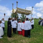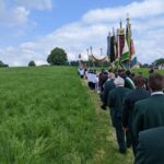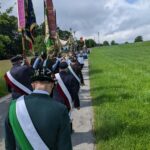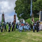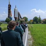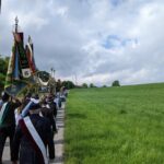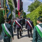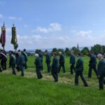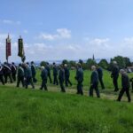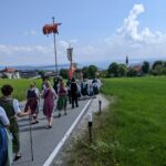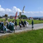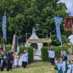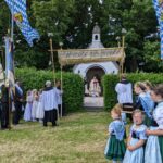 Zusammen mit den Ortsvereinen, den Fahnenabordnungen und den Trachten zog unter dem sogenannten “Himmel” Pfarrer in Ruhe Klaus Wernberger zu den Altarstationen, unter anderem an die Gedächtniskapelle mit der schönen Aussicht auf den Chiemsee.
