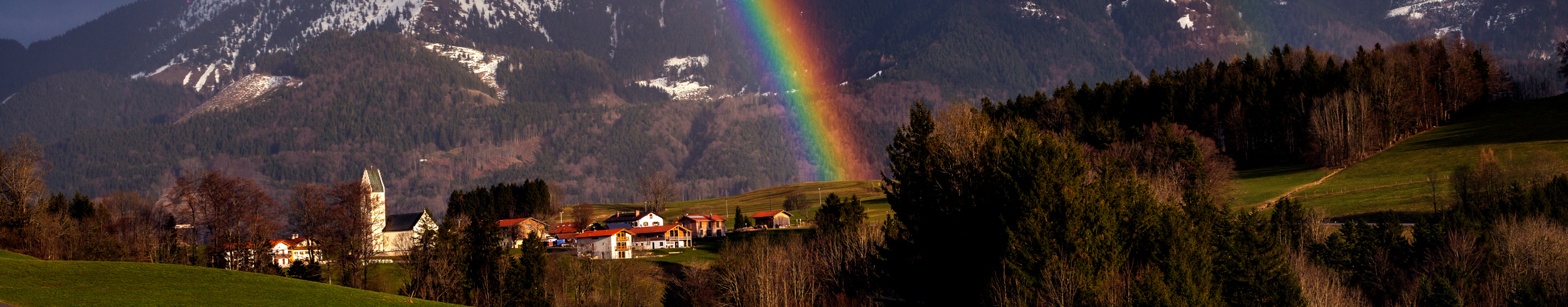 Ein kräftiger Regenbogen zeigte sich dieser März-Tage kurzfristig auf dem Samerberg. Dessen Anblick in Richtung dem Gemeindeteil Rossholzen imponierte auch wegen der dahinter zu sehenden, noch schneebedeckten Hochries.
