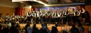 Bericht und Foto: Tschali Wastl, Breitbrunn – Das Foto zeigt den Gesangverein beim traditionellen Frühjahrssingen auf der Bühne der vollbesetzten ChiemseeHalle, begleitet und unterstützt von der “Broatbrunner Blaskapelle”.