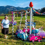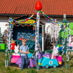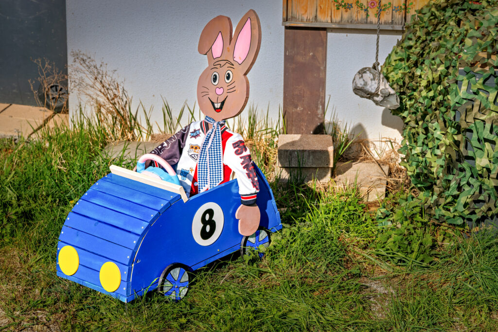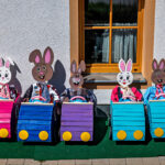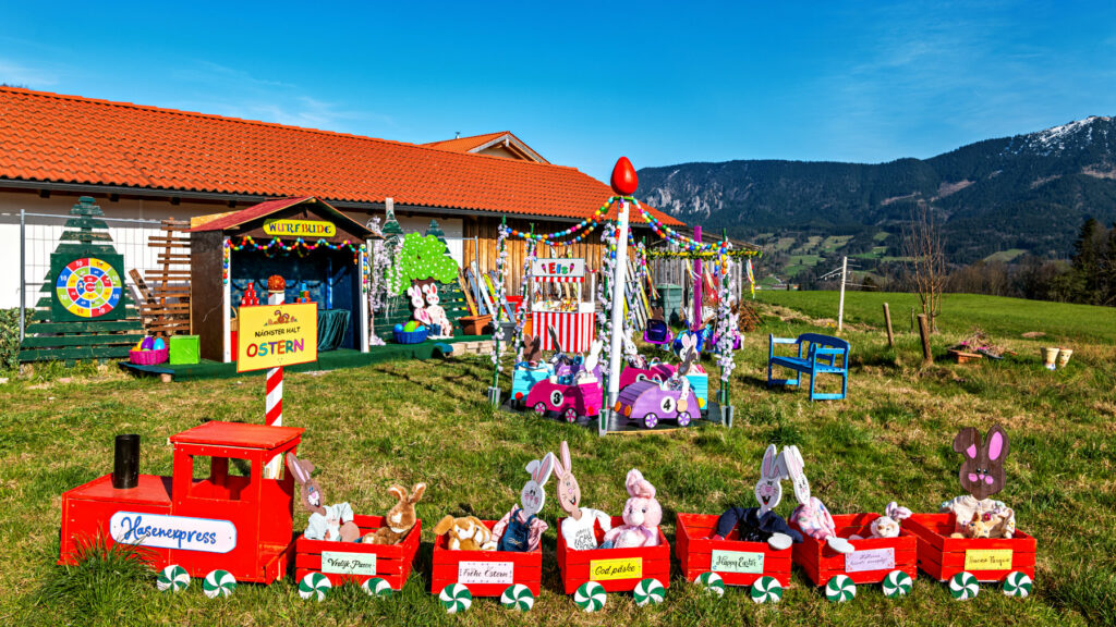 Bereits eine Woche vor Ostern war der “Hasenjahrmarkt” in Obereck fertig und zog zahlreiche neugierige Blicke auf sich. Besonders beliebt: Der knallrote “Osterexpress”, eine Lokomotive, die die Hasenfamilie pünktlich zum Fest chauffiert. Ein Schild am Bahnsteig verkündet augenzwinkernd: „Nächster Halt: Ostern!“ Doch damit nicht genug: Kinder dürfen am Kettenkarussell hupen, sich an der Wurfbude versuchen und sich kleine Süßigkeiten vom “Pizza- und Burgerstand” schnappen – Anfassen ausdrücklich erlaubt!