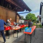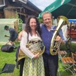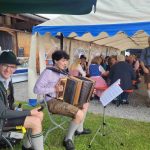 Seit 2019 konnte erstmals wieder der traditionelle Frühschoppen des Musikfördervereins Söllhuben e.V. stattfinden. Mathilde Waritschlager und Sigi Hinterberger gaben der Veranstaltung wie immer Herberge und so konnte das Fest stattfinden. Nach frühmorgendlichem Grauen mit Regen und Sturm klarte es aber zunehmend auf und es blieb trocken. Dem kühlen Wind trotzte ein Zelt der Feuerwehr. Pünktlich nach der Sonntagsmesse erklang um 10.00 Uhr das erste Musikstück – und hier ist eine Neuigkeit zu verkünden:
