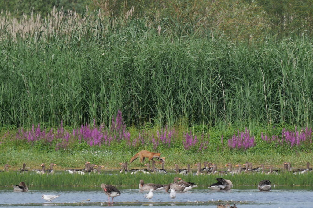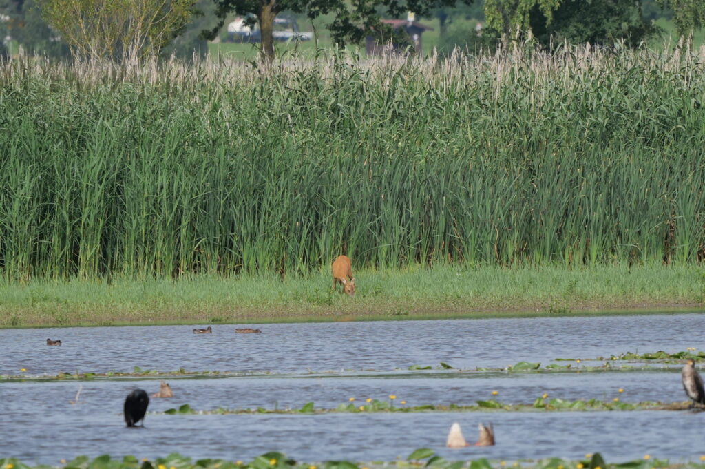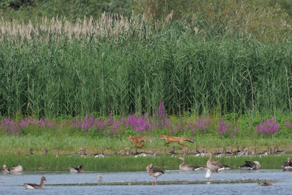 Zuerst erschien dann doch ein Reh, welches friedlich äste, bevor ein Paar Rotfüchse am Ufer direkt bei den Graugänsen erschienen. Diese hatten keine Angst vor den Rotfüchsen, auch wenn diese lautstark am Ufer spielten.