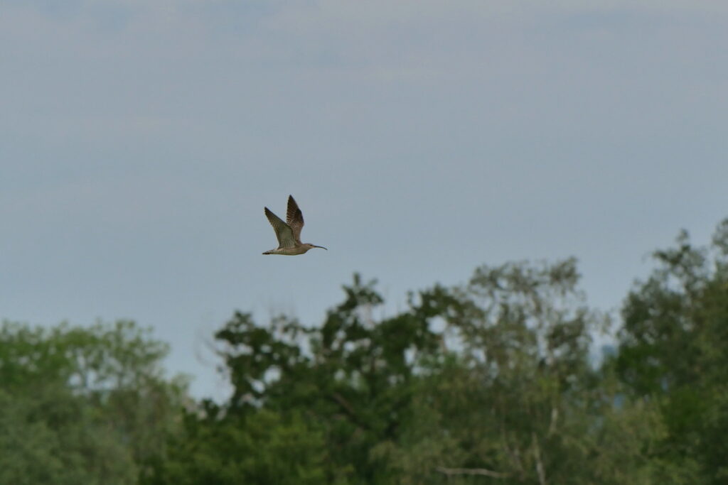 Wenn wenig los ist, lohnt es sich auch immer mal wieder bei “bekannten” Vögeln genauer hinzusehen. So konnte ich schon bald eine juvenile Uferschwalbe mitten unter den zahlreichen Rauchschwalben entdecken. Kurz darauf flog ein Brachvogel ein, welcher ein wenig anders wirkte.