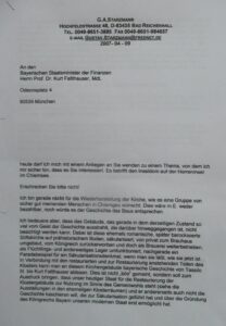 Unser leider vor ein paar Monaten verstorbene Studienkollege Gustav Starzmann hatte in seiner Funktion als Abgeordneter des Bayerischen Landtags und Mitglied des Landesdenkmalrats die Massnahme in einem Schreiben im Jahre 2007 an den damaligen Finanzminister Faltlhauser angeregt.