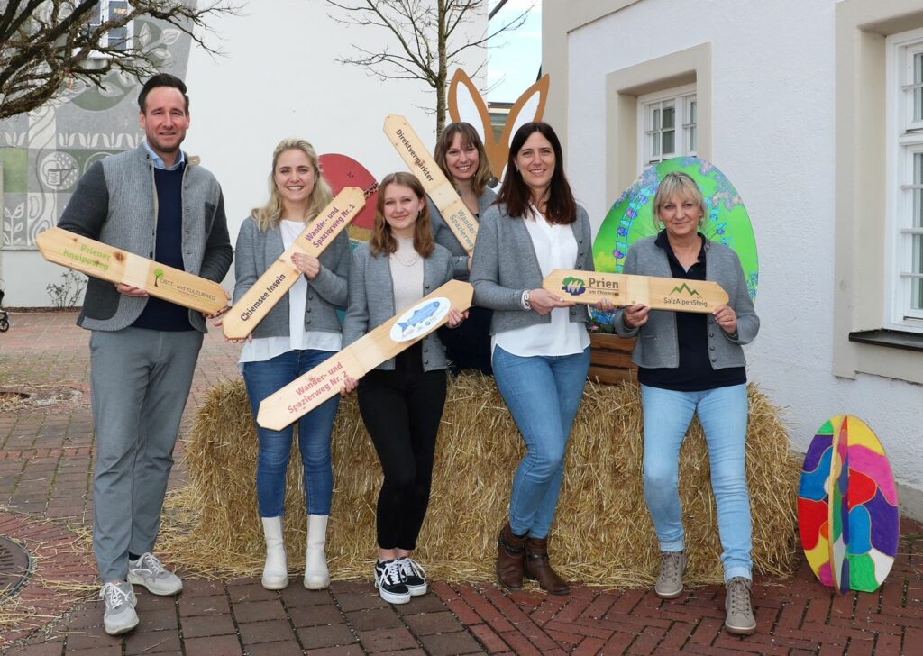 (v.l.n.r.) Wegweiser für die nächste Entdeckungstour. Das Team des Tourismusbüros Prien – der Leiter des Tourismusbüros Florian Tatzel und seine Kolleginnen Stefanie Sattlberger, Leonie Muschalla, Sarah Völk, Andrea Stephan und Gaby Hauk – informiert über zahlreiche Führungen, bei denen man Prien am Chiemsee und Umgebung auf vielfältige Weise kennenlernen kann.