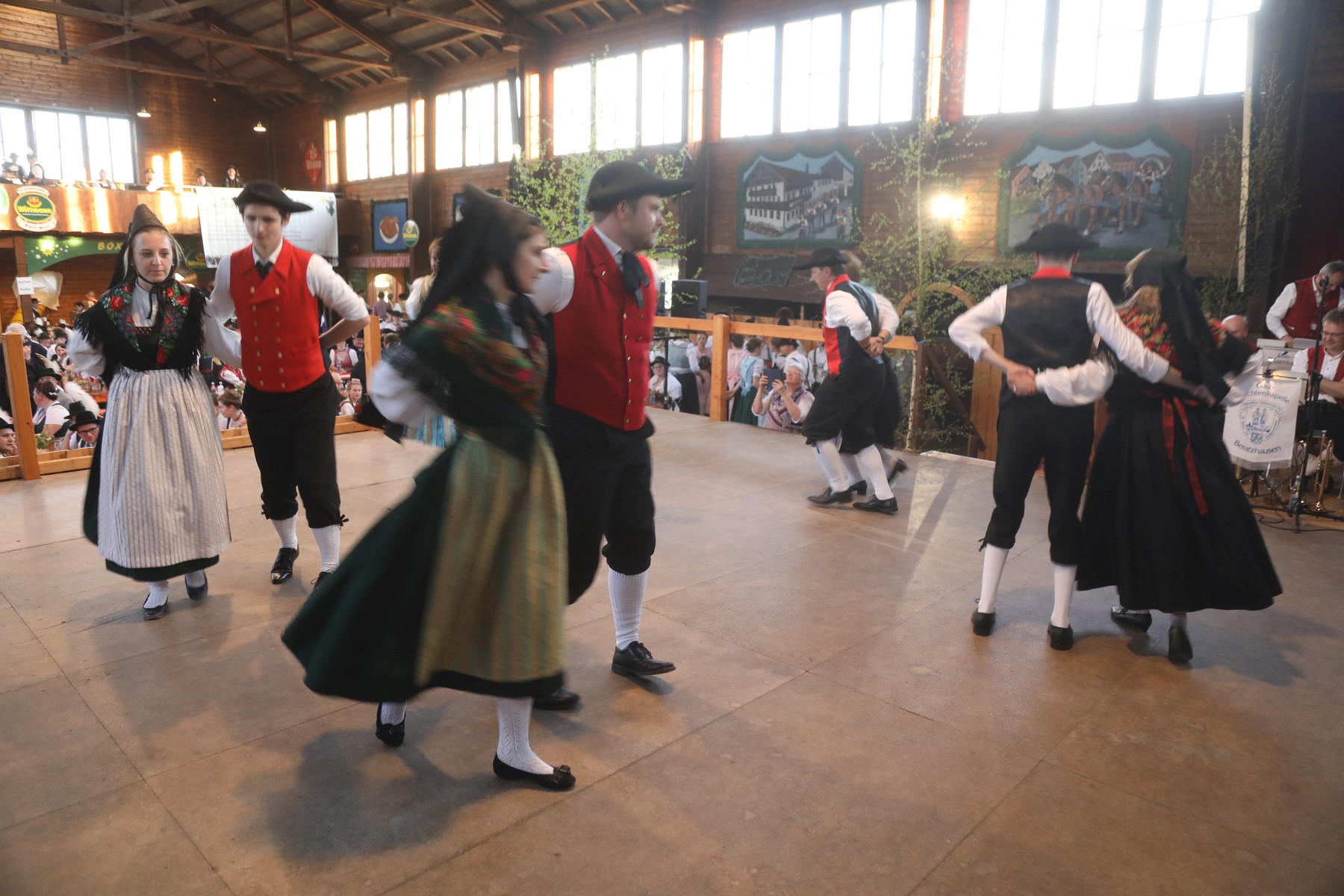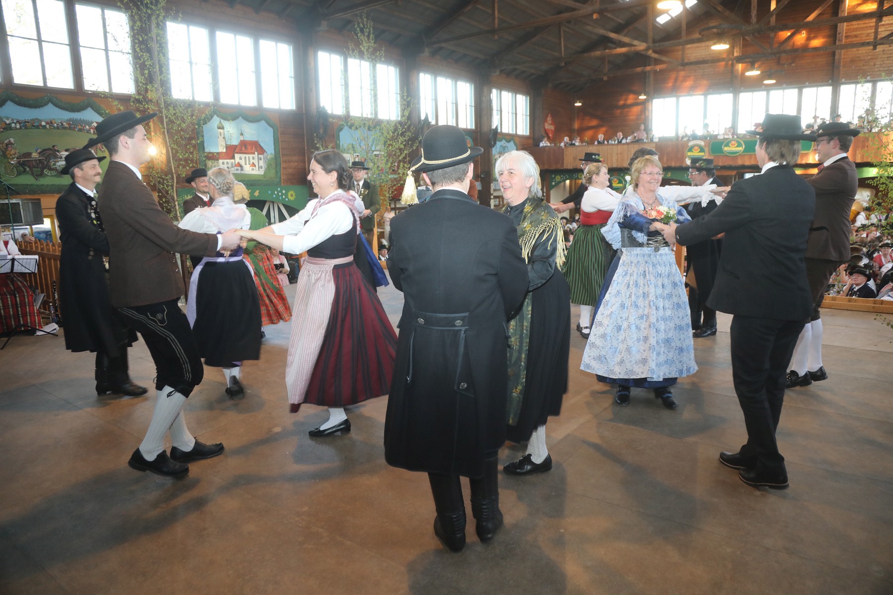 Für die nimmermüde musikalische Begleitung zugunsten einer stets voll beanspruchten und großen Bühne sorgten die Gautrachtenkapelle Beratzhausen aus der Oberpfalz, die Rottauer Tanzlmusi aus dem Chiemgau und die die Körnia Rucksa Musikanten aus Unterfranken. Dieses Tanzfest war eine bunte Mischung aus allgemeinen Tanzrunden, Auftritten der Gaugruppen der angeschlossenen Gauverbände und Gemeinschaftsplattlern und trugen durch die Besonderheit der Mitwirkung von Trachtlern aus allen Regionen Bayerns sicherlich zu einer guten Präsentation der Trachtensache in der Öffentlichkeit bei. Zu den Gaugruppen-Mitgliedern zählten in der Regel die jeweils besten Plattler und TänzerInnen, die sich in jährlichen Wettbewerben qualifizieren und mit ihren schneidigen Darbietungen die Aushängeschilder ihrer Verbände darstellen. Ein besonderes “Vergelt’s Gott galt dem Trachtenverein Hinterskirchen und der Gastwirtsfamilie Rampl für ihren Vorbereitungsfleiß für das fünfte Gesamtbairische Tanzfest. Dessen gesamter Reinerlös kommt dem Trachtenkulturzentrum des Bayerischen Trachtenverbandes in Holzhausen zugute, wo bereits die Geschäftsstelle des Bayerischen Trachtenverbandes und der Bayerischen Trachtenjugend, einen großen Zeltlagerplatz mit Versorgerhaus sowie ein großes Trachtendepot für Dauer- und Sonderausstellungen enthält.